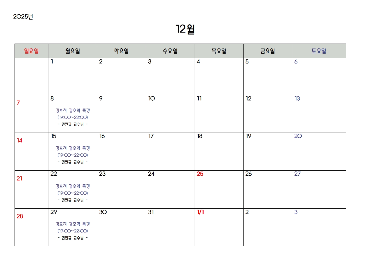 - 2025년 12월 : 대통령 경호처 경호학 특강 > -> 4회, 1회 3시간 강의